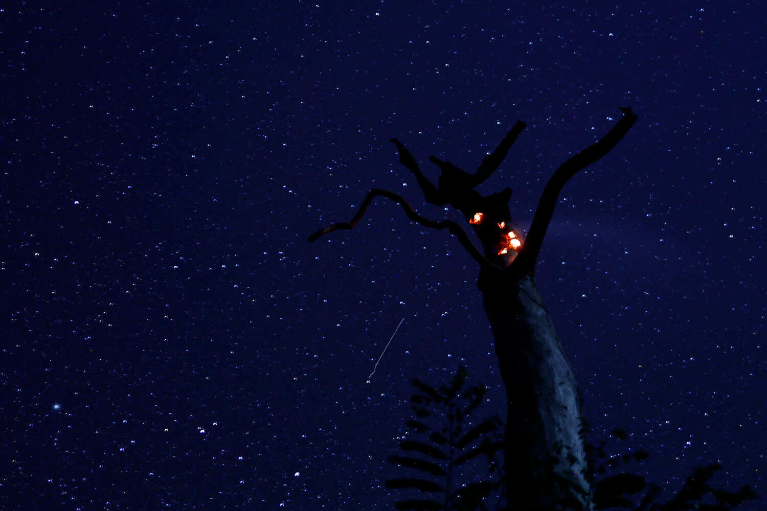 Ueslei Marcelino, da Reuters, registrou a árvore queimando no Pantanal, em meio ao céu estrelado.