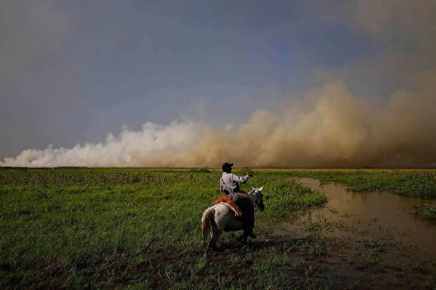 Durante oito dias, o fotógrafo Ueslei Marcelino e seu colega cinegrafista Leonardo Benassatto percorreram o Pantanal em barco de pesca, em cima de trator e até montados a cavalo para registrar o pior incêndio que já atingiu a região, com 2.571 focos de calor em todo o bioma. O fogo nos seis primeiros meses do ano já é 8% maior em comparação a 2020, fazendo de 2024 o recorde de queimadas. A devastação alcançou 502.650 hectares, em comparação com os 249.125 hectares de 2020 – um aumento de 102%. Uma área quase quatro vezes maior que o território da cidade de São Paulo já queimou este ano.