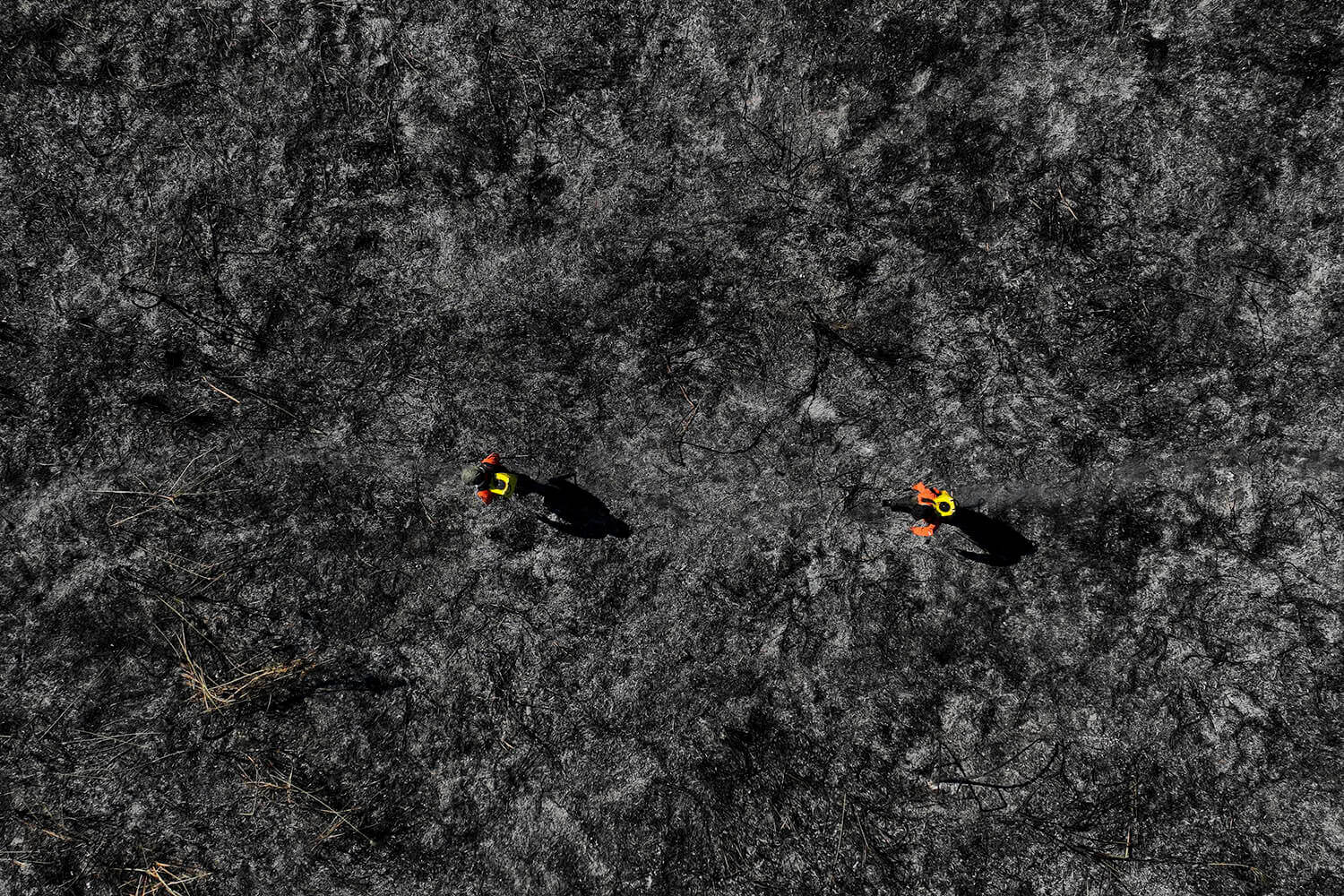 Bombeiros voluntários da brigada do Alto Pantanal caminham por área queimada enquanto trabalham para extinguir um incêndio no Pantanal. Foto de Ueslei Marcelino/Reuters.