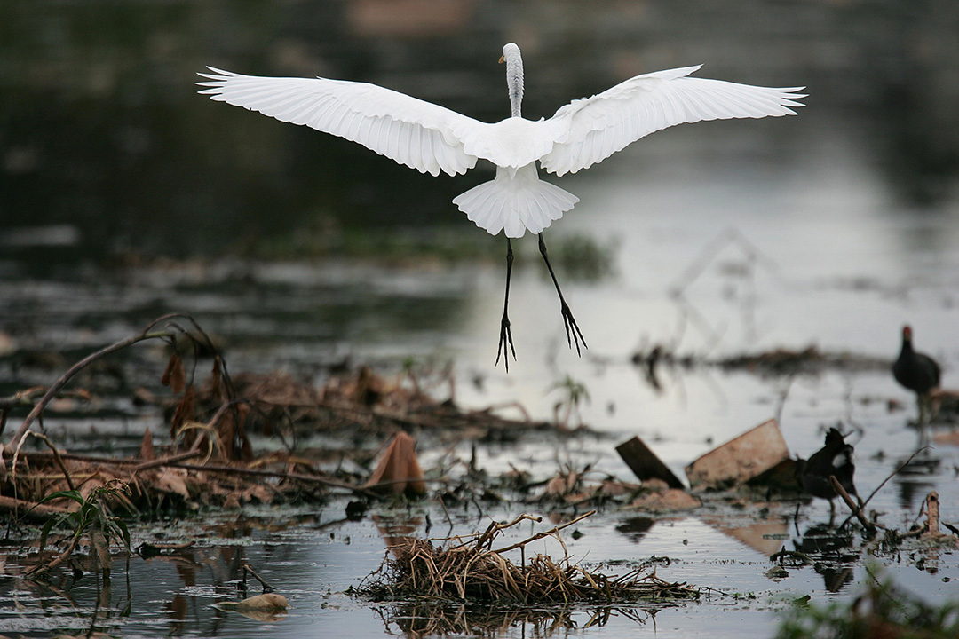 Garça pousa na lagoa de Carapicuíba (SP), coberta por lodo retirado do Tietê em obra para aprofundar a calha do rio. De acordo com o Ministério Público Federal, a lagoa foi contaminada por chumbo, cádmio, mercúrio e DDT, um poluente altamente cancerígeno, com a terra e o lixo trazidos do Tietê. 16/3/2006. Foto: Antônio Gaudério/Folhapress Digital