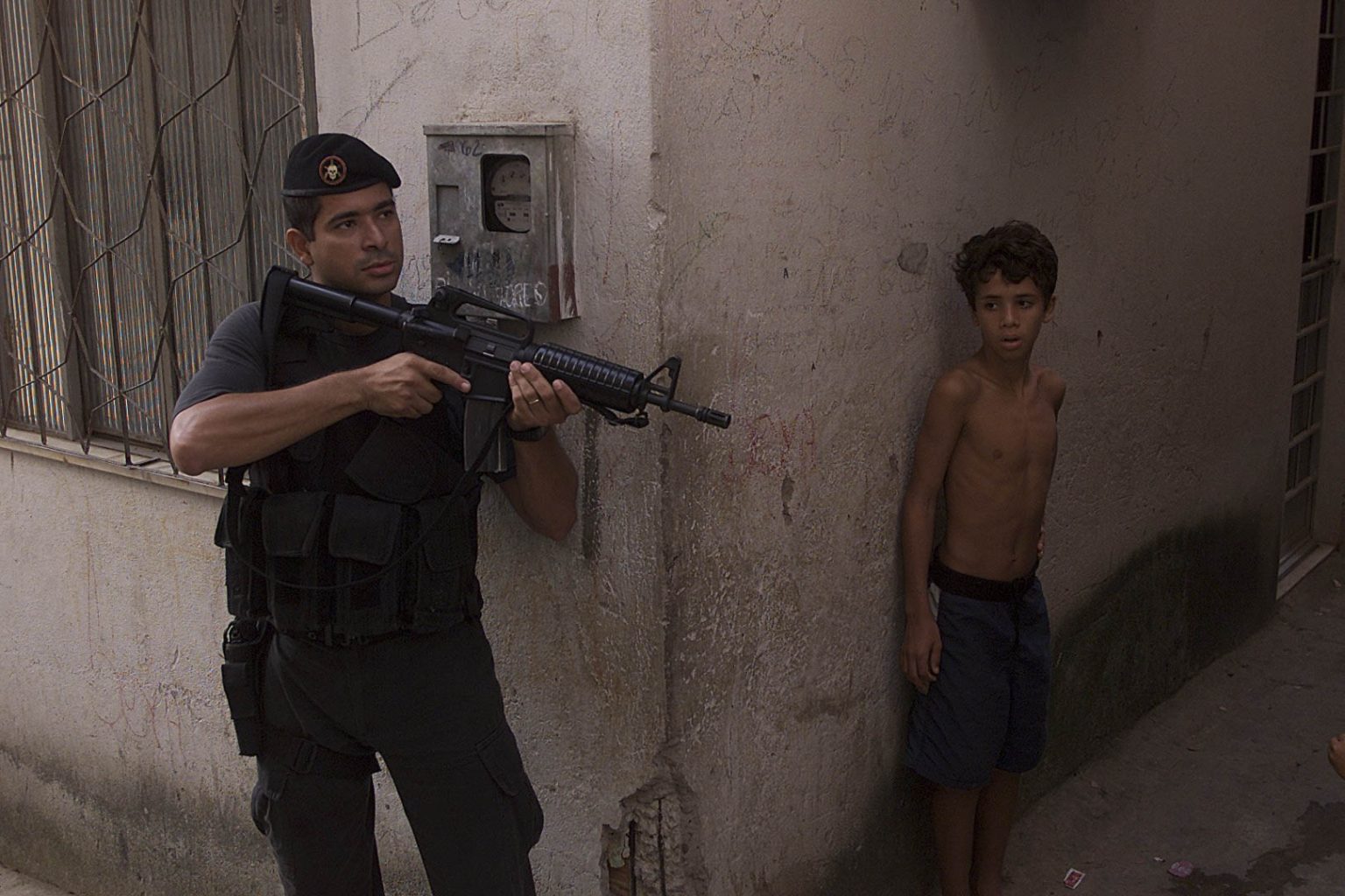 Policiais vigiam a favela do Morro do Dendê, na Ilha do Governador, Rio de Janeiro, RJ, depois de tiroteio. 2001. Folhapress/Digital