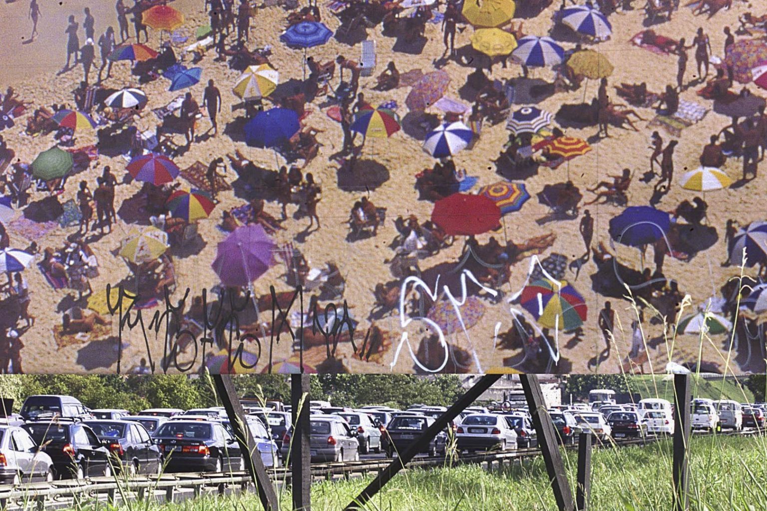 Veículos enfrentam trânsito congestionado na rodovia dos Imigrantes, ao passar por cartaz da Sabesp com imagem de praia. 1998. Folhapress