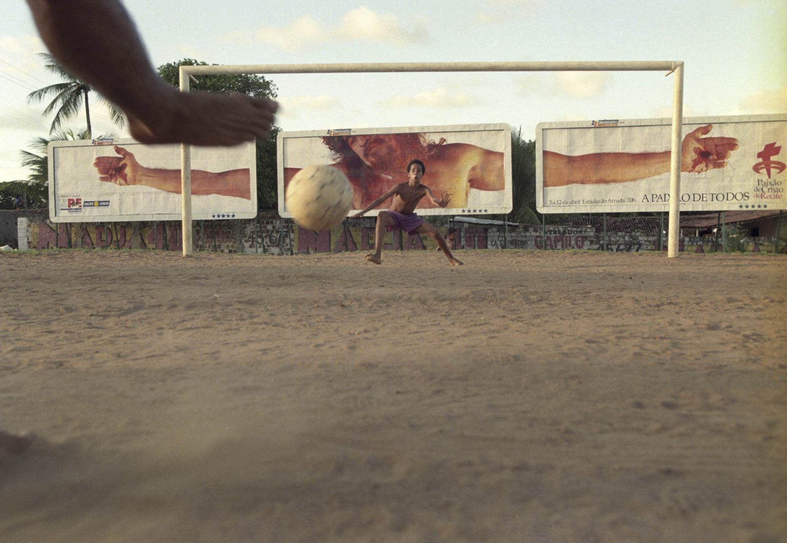 Jonas da Silva defende uma bola em campinho de futebol na cidade de João Pessoa, PB, na frente de outdoor com imagem de Cristo. 1998. Folhapress