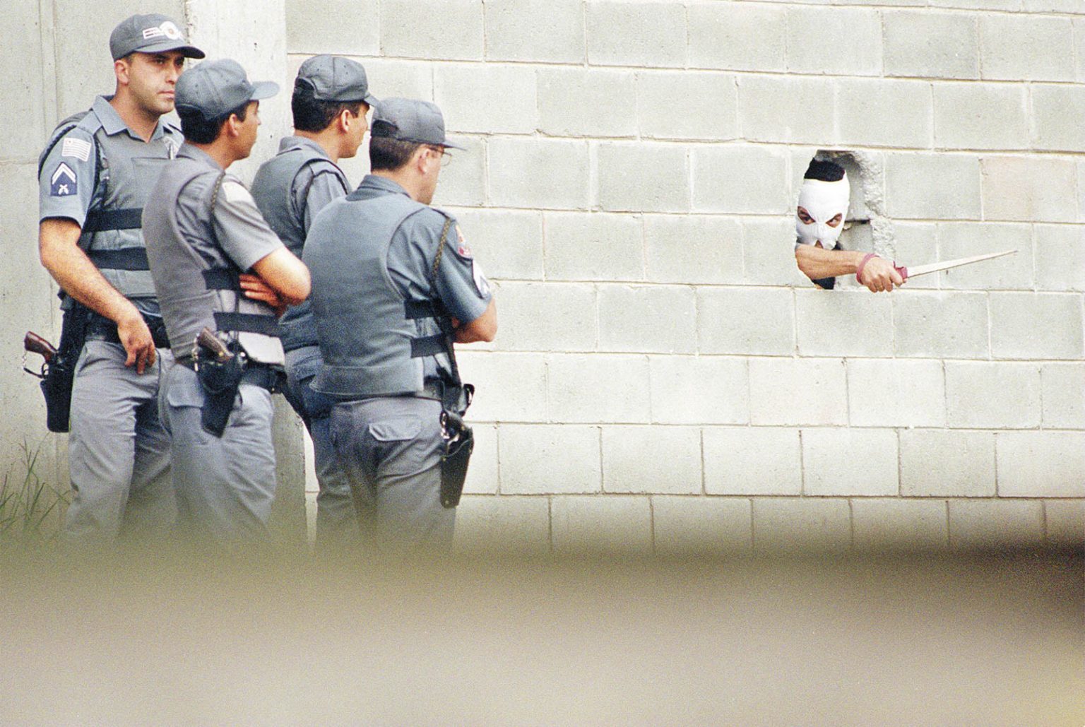 Rebelião de detentos no Cadeião 2, em Pinheiros, Zona Oeste de São Paulo: preso armado com estilete observa PMs. 1997. Folhapress