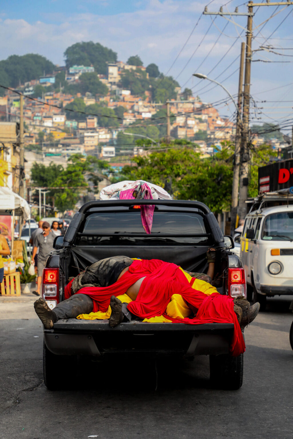 Em certo momento, seguiu para a Mata da Vacaria, na Serra da Misericórdia, quando ouviu relatos de que havia mortos no local. Os parentes tinham ido por conta própria resgatar os corpos. Seguiam de motos e caminhonetes, e levavam lençóis para tapar os familiares.